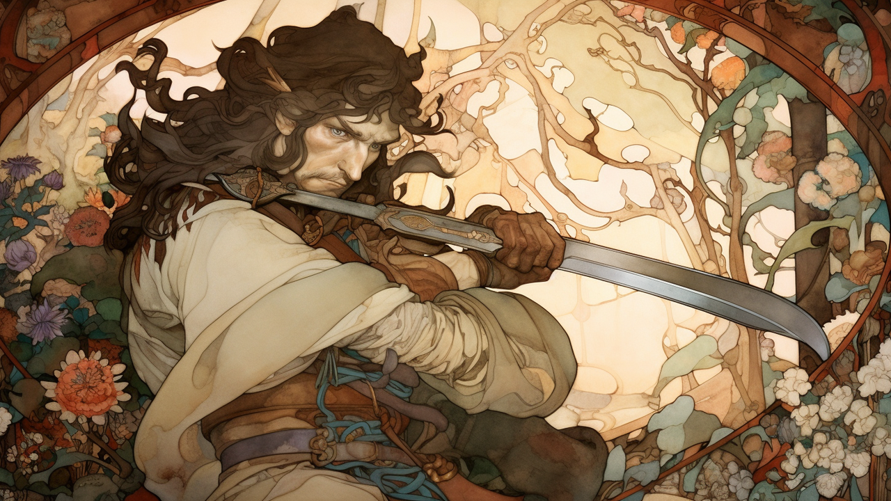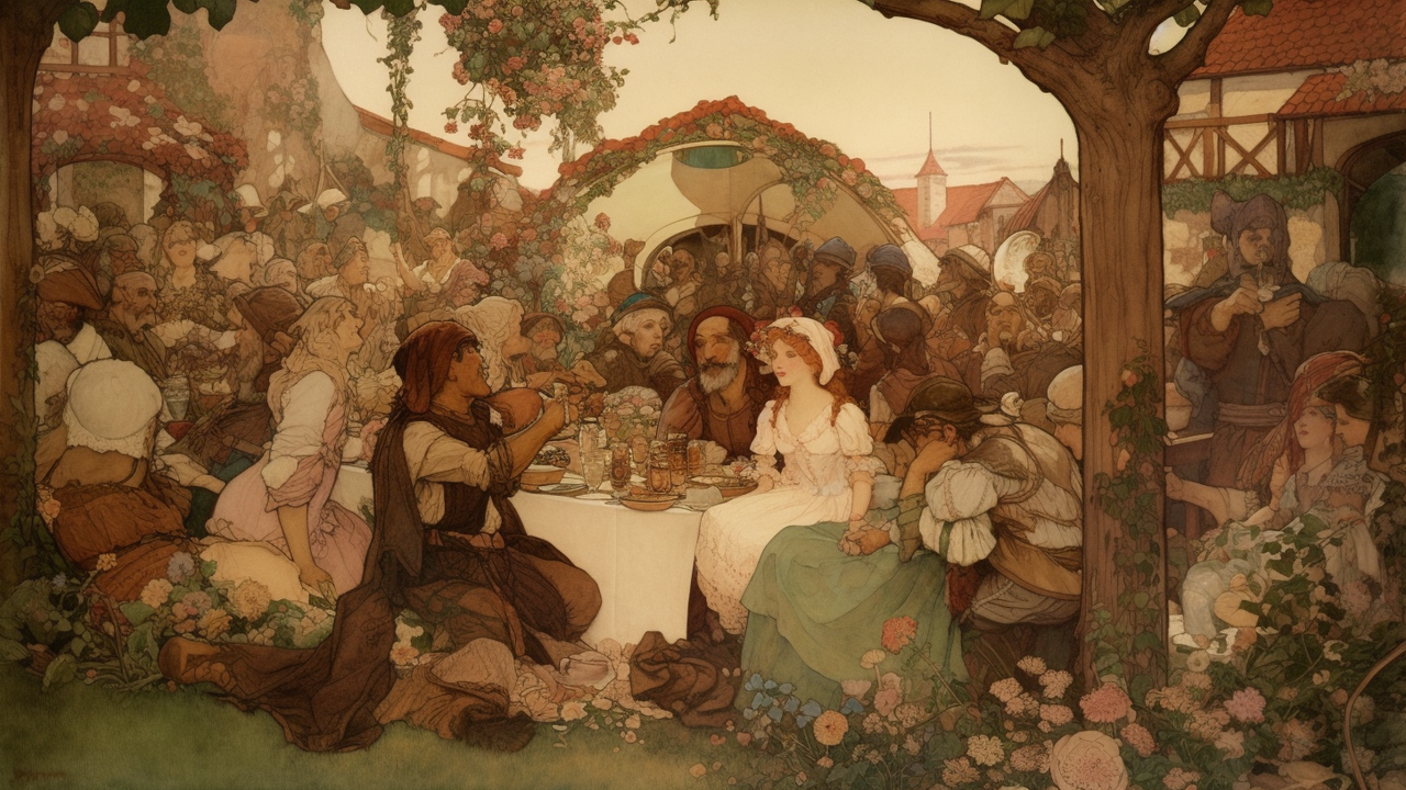 Droits réservés : Image générée avec Midjourney: hobbiton birthday party, a painting by mucha --ar 16:9 --v 5
